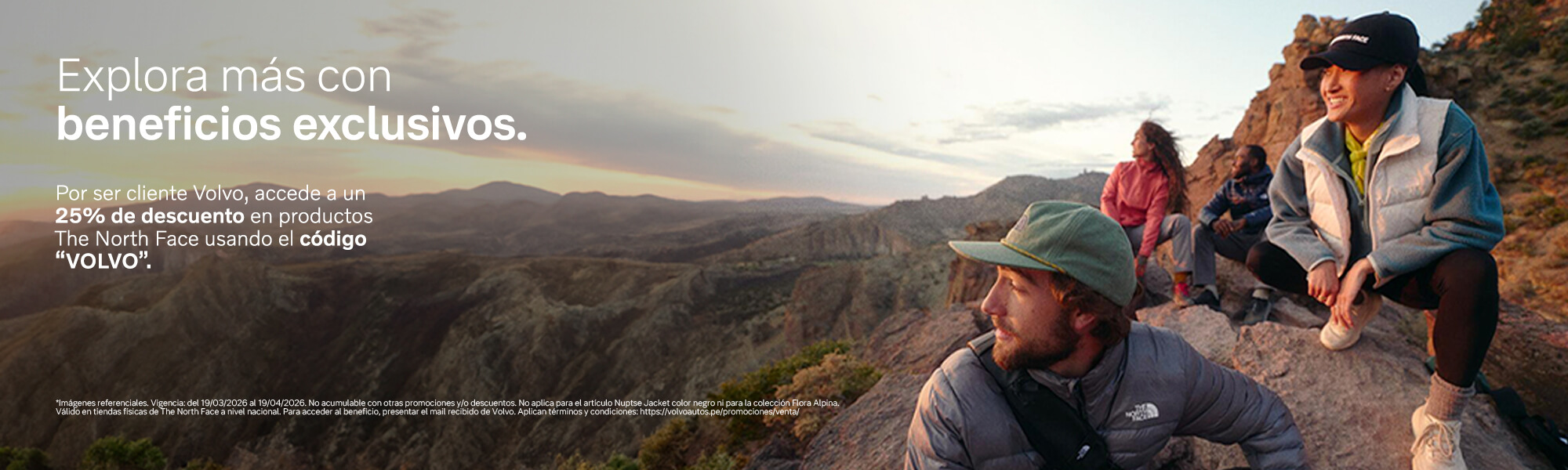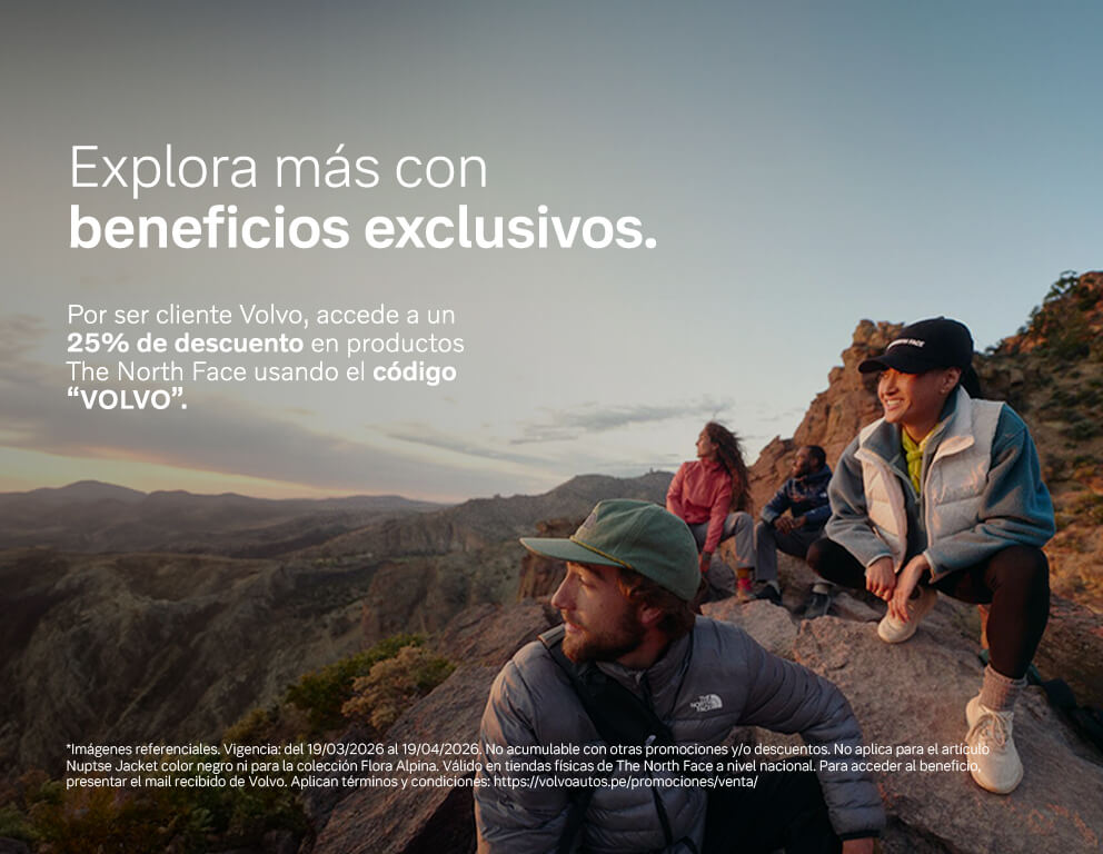 La campaña estará vigente desde el 19/03/2026 al 19/04/2026. Los clientes beneficiados podrán acceder a un 25% de descuento en los productos comercializados en las tiendas oficiales de “The North Face” a nivel nacional. Promoción no acumulable con otras promociones, descuentos, cupones y/u ofertas. El descuento no aplica para el artículo Nuptse Jacket color negro ni para la colección Flora Alpina. Beneficio válido exclusivamente en tiendas físicas de The North Face (ubica las tiendas en https://www.thenorthface.com.pe/tiendas). Para hacer efectivo el descuento, el cliente deberá mostrar el correo electrónico recibido por parte de Volvo e indicar el código de cupón VOLVO al momento de la compra. Stock mínimo: 01 unidad por producto. El 25% de descuento se aplicará únicamente a los productos que se encuentren en stock. El descuento no podrá ser monetizable, transferido, intercambiado, acumulado ni canjeado por bienes o servicios distintos a los otros beneficios. Imágenes referenciales Aplican términos y condiciones disponibles de forma gratuita, revisar: https://volvoautos.pe/promociones/venta/.