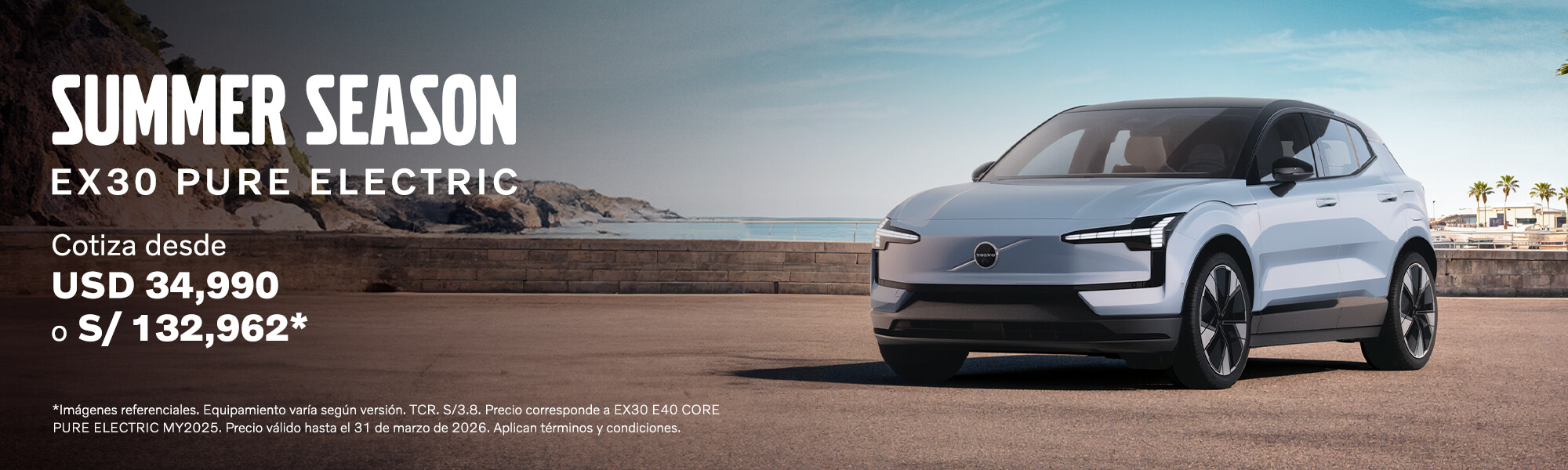 Imágenes referenciales. Equipamiento varía según versión. TCR. S/3,8, puede variar según el tipo de cambio del día en que se realice la transacción. Precio corresponde a EX30 E40 CORE PURE ELECTRIC MY2025. Precio válido hasta el 31 de marzo de 2026 o hasta agotar stock de 5 unds. Promoción incluye cargador doméstico de 7 kW por la compra de cualquier vehículo enchufable Volvo. No incluye la instalación. Servicios de mantenimiento preventivo los 03 primeros años. Garantía de batería de alta tensión cubierta por 08 años o 160 000 km, lo que suceda primero. Promoción válida hasta el 31 de marzo de 2026. Autonomía corresponde a EX30 E60 Ultra Pure Electric. El protocolo WLTP permite medir la autonomía en condiciones controladas. La autonomía real de un vehículo varía según el tipo de conducción, el tipo de ruta, el peso de la carga y las condiciones climáticas, según ciclo WLTP.