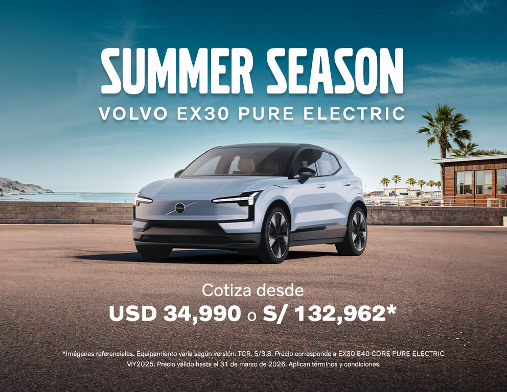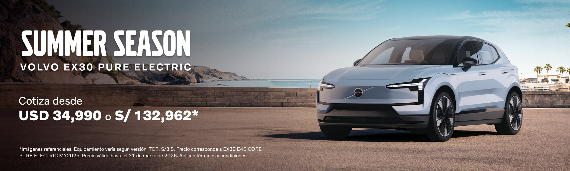 Imágenes referenciales. Equipamiento varía según versión. TCR. S/3,8, puede variar según el tipo de cambio del día en que se realice la transacción. Precio corresponde a EX30 E40 CORE PURE ELECTRIC MY2025. Precio válido hasta el 31 de marzo de 2026 o hasta agotar stock de 5 unds. Promoción incluye cargador doméstico de 7 kW por la compra de cualquier vehículo enchufable Volvo. No incluye la instalación. Servicios de mantenimiento preventivo los 03 primeros años. Garantía de batería de alta tensión cubierta por 08 años o 160 000 km, lo que suceda primero. Promoción válida hasta el 31 de marzo de 2026. Autonomía corresponde a EX30 E60 Ultra Pure Electric. El protocolo WLTP permite medir la autonomía en condiciones controladas. La autonomía real de un vehículo varía según el tipo de conducción, el tipo de ruta, el peso de la carga y las condiciones climáticas, según ciclo WLTP.