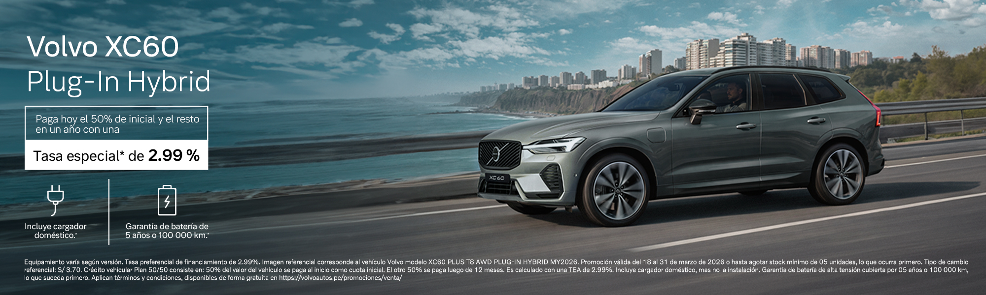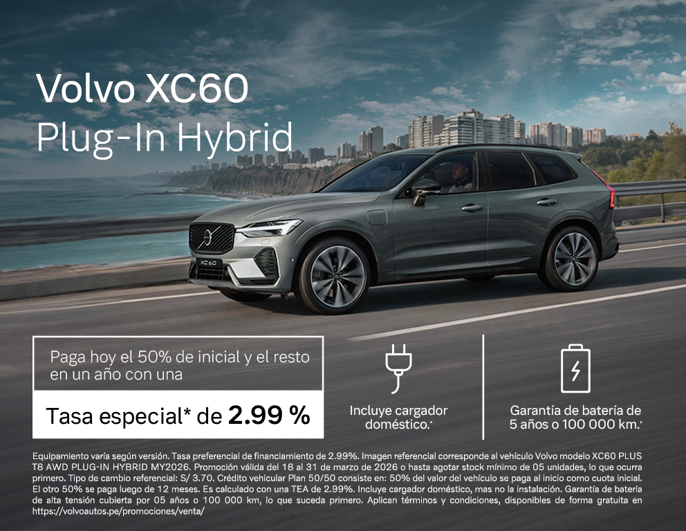 Campaña organizada por Maquinaria Nacional S.A.C Perú (Manasa). Equipamiento varía según versión. Tipo de cambio referencial (TCR): S/ 3.70; no obstante, se aplicará el tipo de cambio vigente de Manasa del día en el cual se realiza la transacción.  preferencial aplicable de 2.99%. Imagen corresponde al vehículo Volvo modelo XC60 PLUS T8 AWD PLUG-IN HYBRID MY2026. Promoción válida del 18 al 31 de marzo de 2026 o hasta agotar stock mínimo de 05 unidades, lo que ocurra primero. Financiamiento otorgado por Sociedad Intermediadora de Créditos Vehiculares S.A.C. (Credicar), el cual se encuentra sujeto a evaluación crediticia. TCEA Máxima Referencial (3.60%). Esta incluye Desgravamen e intereses. Crédito vehicular Plan 50/50 calculado con una TEA de 2.99% y a un plazo de 12 meses aplicable a un vehículo con precio de venta de US$ 59,990.00 o S/ 221,963, monto financiado de US$ 29,995.00 o S/ 110,982. Cuota inicial de 50%, equivalente a US$ 29,995.00 o S/ 110,982. Seguro de desgravamen individual convencional (sin devolución) de 0.0250% mensual. La campaña 50-50 consiste en lo siguiente: 50% del valor del vehículo se paga al inicio como cuota inicial. El otro 50% se paga en 12 meses, es decir, se paga al año en una sola cuota final. La cuota no incluye seguro vehicular, gastos de inmatriculación, impuesto vehicular ni SOAT, desgravamen e intereses. Promoción incluye cargador doméstico de 7 kW por la compra de cualquier vehículo enchufable Volvo. No incluye la instalación. Garantía de batería de alta tensión cubierta por 05 años o 100 000 km, lo que suceda primero. Imágenes referenciales. Aplican términos y condiciones, disponibles de forma gratuita en https://volvoautos.pe/promociones/venta/