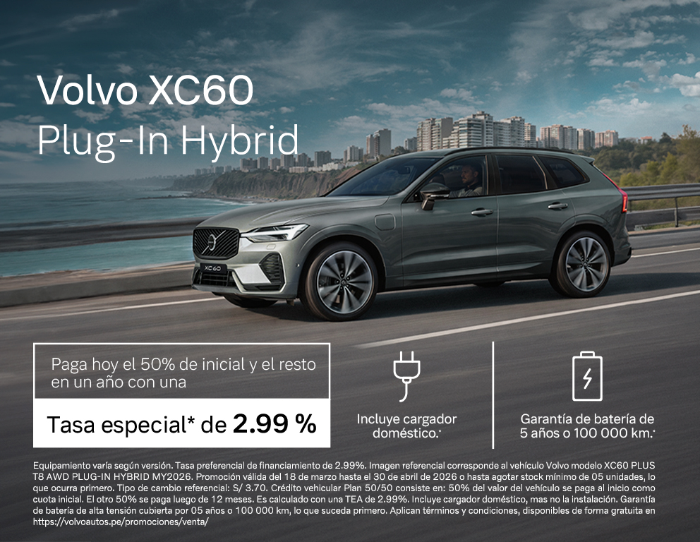 Imágenes referenciales. Equipamiento varía según versión. TCR. S/3,8, puede variar según el tipo de cambio del día en que se realice la transacción. Precio corresponde a XC60 PLUS T8 AWD PLUG-IN HYBRID MY2026. Precio válido hasta el 30 de junio de 2026 o hasta agotar stock de 5 unds, lo que suceda primero.Promoción incluye cargador doméstico de 7 kW por la compra de cualquier vehículo enchufable Volvo. No incluye la instalación. Garantía de batería de alta tensión cubierta por 05 años o 100 000 km, lo que suceda primero. Promoción válida hasta el 30 de junio de 2026. Autonomía corresponde a XC60 POLESTAR T8 AWD PLUG-IN HYBRID. El protocolo WLTP permite medir la autonomía en condiciones controladas. La autonomía real de un vehículo varía según el tipo de conducción, el tipo de ruta, el peso de la carga y las condiciones climáticas, según ciclo WLTP.
